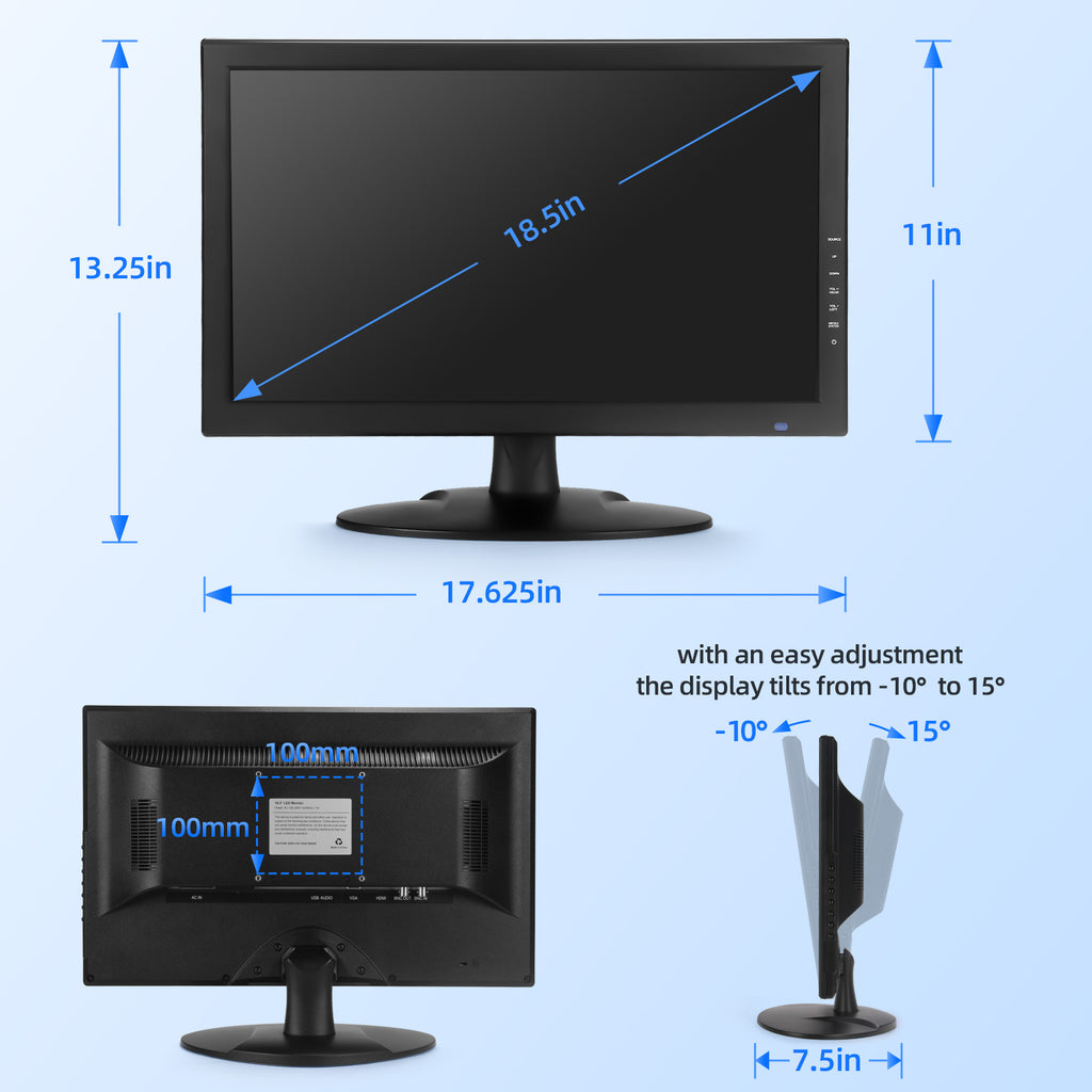 • Versatile viewing with BNC input: Our 18.5" CCTV monitor offers flexible viewing options. Connect seamlessly to your PC, DVR, NVR, and gaming console using various ports, including 1x BNC, 1x HDM,1 USB and 1 x VGA. Experience the convenience of versatile inputs and VESA mount capability for an optimal viewing experience.